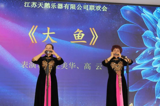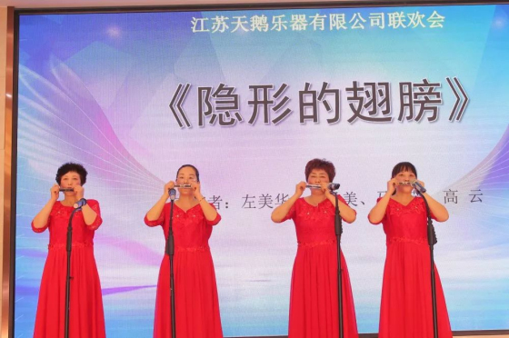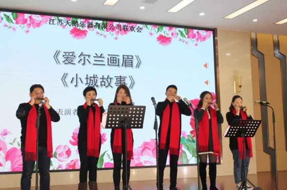 表彰會(huì)結(jié)束后,接下來(lái)的聯(lián)歡會(huì)也熱鬧非凡。聯(lián)歡會(huì)由萬(wàn)詩(shī)蔓、劉亮主持,口琴吹奏、舞蹈、詩(shī)朗誦、歌唱,表演形式多樣,今年更是請(qǐng)到了天鵝摯愛(ài)口琴班的同學(xué)們來(lái)到聯(lián)歡會(huì)現(xiàn)場(chǎng),獻(xiàn)上了《愛(ài)爾蘭畫(huà)眉》、《小城故事》、《歡聚一堂》等精彩的口琴表演。作為專(zhuān)業(yè)生產(chǎn)口琴的企業(yè),天鵝公司涌現(xiàn)了一大批口琴演奏人才,他們共同組成了天鵝口琴樂(lè)團(tuán),帶來(lái)了一首又一首旋律優(yōu)美、吹奏難度較高的口琴演奏。