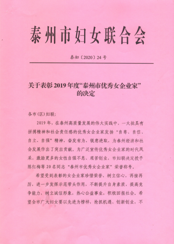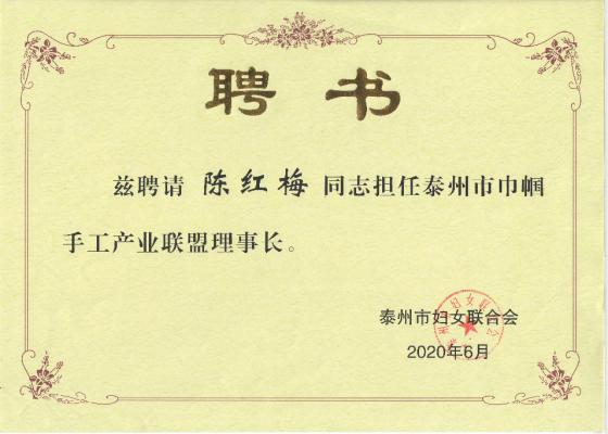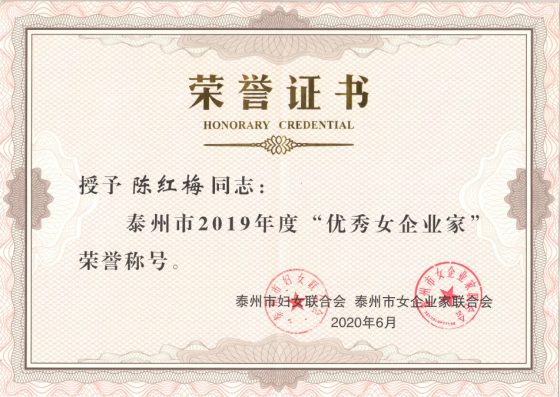 在泰州市巾幗三大聯盟成立大會上,天鵝樂器董事長陳紅梅被泰州市婦女聯合會聘為泰州市巾幗手工產業聯盟理事長,并被泰州市婦女聯合會和泰州市女企業家聯合會聯名授予泰州市2019年度“優秀女企業家”榮譽稱號。