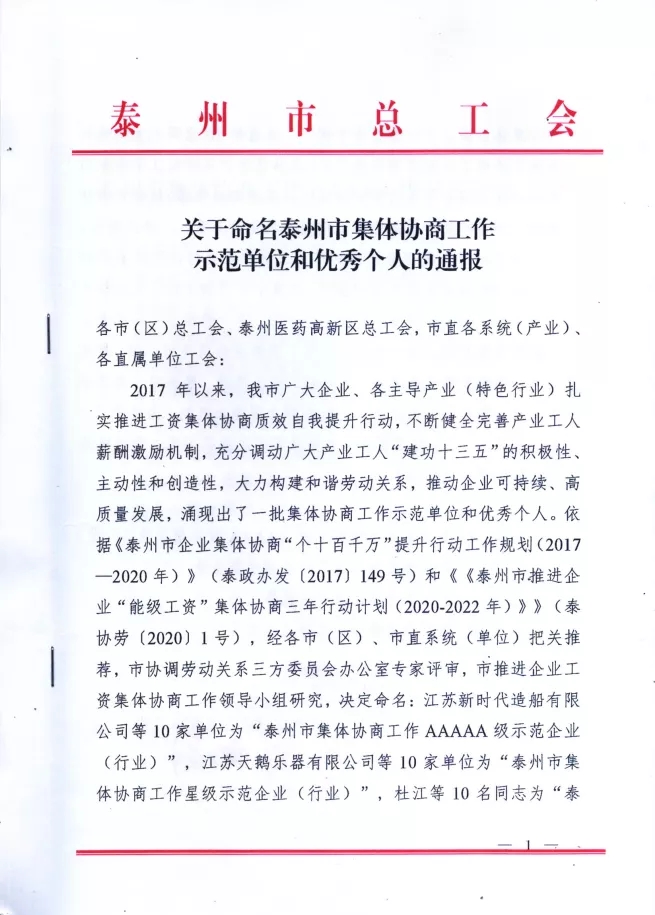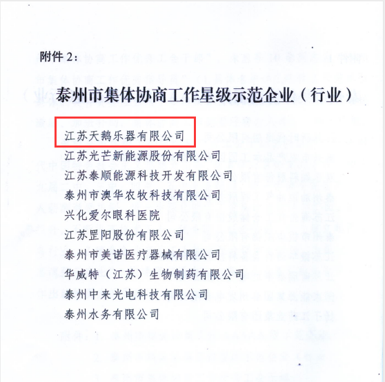 天鵝樂器被評(píng)為“泰州市集體協(xié)商工作星級(jí)示范企業(yè)(行業(yè))”