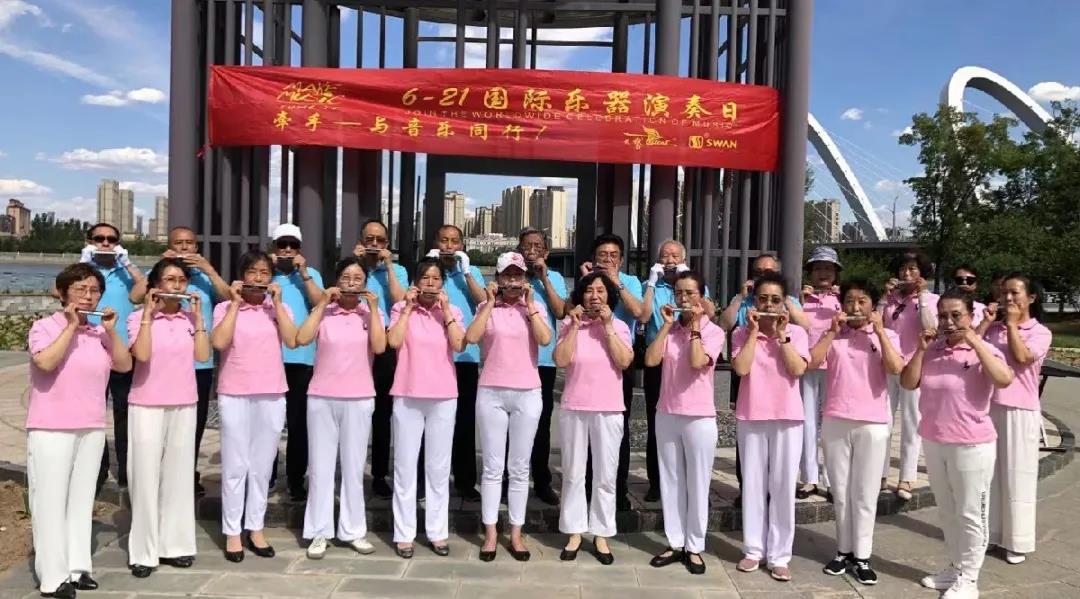 為慶祝中國共產黨百年華誕,充分展示天鵝公司推動音樂教育“三進”工程的成果,天鵝公司在6月21日這一天組織12個口琴樂隊在公司廣場、音樂廳及多個車間舉行口琴演出聯誼活動。天鵝樂器作為聯合主辦單位,聯合了紫丁香天鵝口琴社、嘉興市嘉善縣青少年宮、嘉興琴藝口琴培訓中心、南京強國口琴藝術團、山東德州大眾口琴樂團、大同市御河九號口琴隊、蘭州市城關區東崗小學、云南知青口琴樂團、青島口琴大聯盟、東臺市老來樂藝術團等單位共同開展“6·21國際樂器演奏日”,體現音樂帶來的快樂,給人注入實實在在的活力和動力。